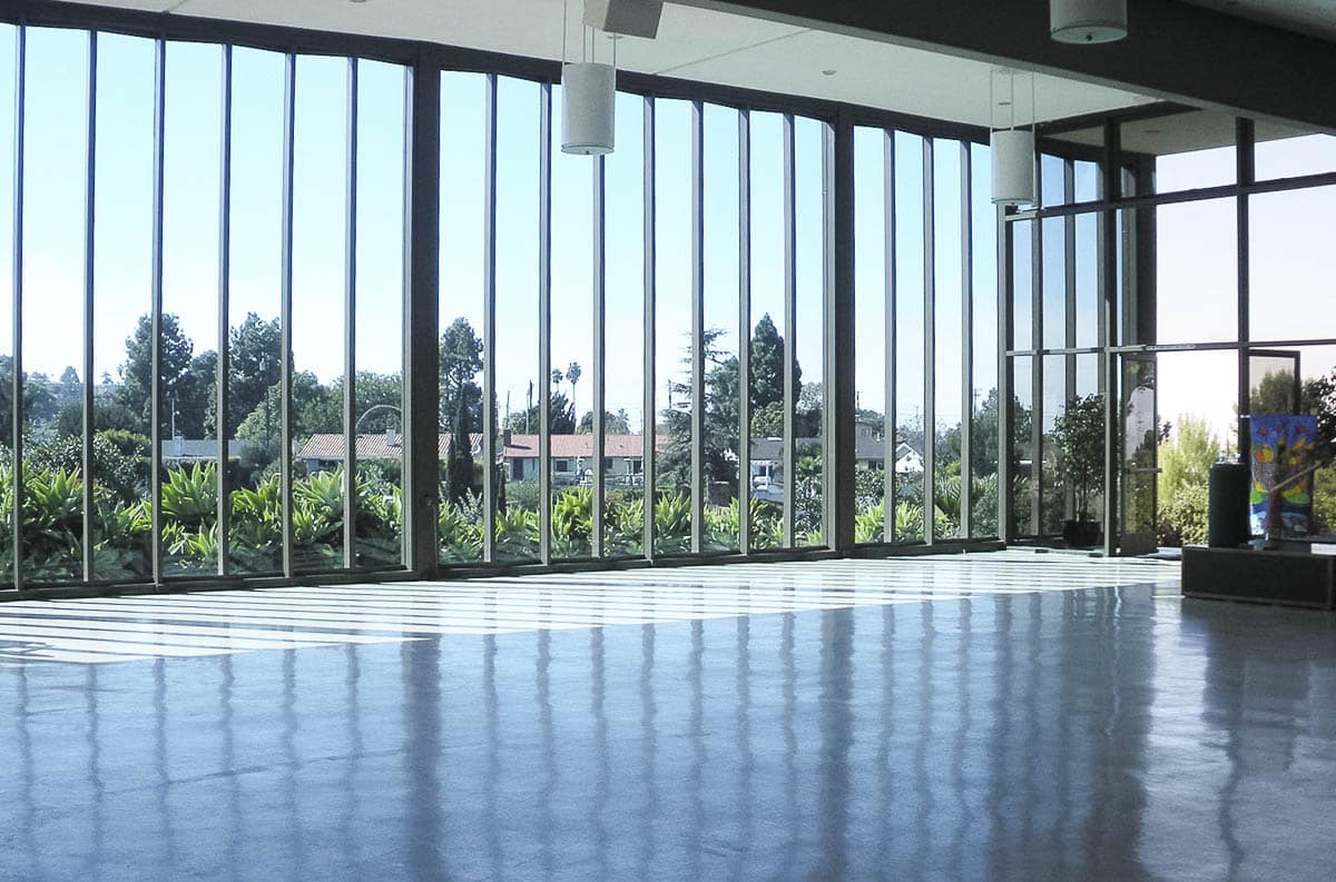 This versatile open space offers ample opportunity for personalizing your event. 250 guests can be seated theatre-style for your indoor wedding, concert or meeting. An in-ceiling projector screen is available for slideshows. The Hall comfortably seats 150 at tables. Or clear the space for a party and dancing. A Yamaha grand piano is available for concerts and recitals with a backdrop of the canyon and sky seen through our new beautiful floor-to-ceiling blue glass wall. No air conditioner is necessary due to the breezes off the canyon.