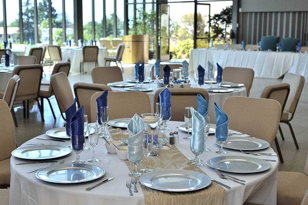Enjoy this wonderful setting for an open-air reception. Our patio features a lovely fountain and beautiful paver stones. You and your guests will feel connected to nature in this beautiful outdoor space. The patio easily accommodates 150 guests seated at tables, and it is conveniently located adjacent to our Hall and the kitchen. Retractable awnings provide cool comfort and shade on sunny days.